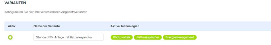 Beim nächsten Menüpunkt Batteriespeicher kann ein entsprechender Akku aus Ihrer Bibliothek für die PV-Anlage gewählt werden. Sollte hier nicht die gewünschte Komponente auswählbar sein, muss diese zuerst über die Bibliothek hinzugefügt werden. Falls der Punkt Batteriespeicher gar nicht erst angezeigt wird, aktivieren Sie zuerst die Technologie für dieses Projekt unter Varianten. Die jeweilige Technologie ist aktiviert, wenn diese, wie im Bild unten, grün hinterlegt ist. Mehr Informationen zu Varianten finden Sie unten in diesem Artikel.
