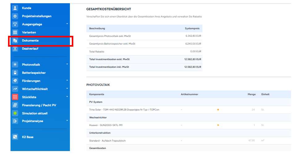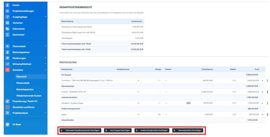 Weiter unten folgen die detaillierten Kosten, gegliedert in die jeweiligen Gruppen des PV-Systems. Über die schwarzen Buttons unterhalb kann jeweils die Stückliste mit weiteren Komponenten, welche vorher in der Bibliothek angelegt wurden, ergänzt werden.