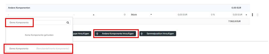 Es ist ebenso möglich, ohne vorheriges erfassen in der Bibliothek, weitere Einträge direkt in die Stückliste mit aufzunehmen. Hierzu wird nach einem Klick auf „Andere Komponente hinzufügen“ im Suchfeld des Dropdownmenüs eine entsprechende Bezeichnung eingegeben und „Benutzerdefinierte Komponente“ ausgewählt. Anschließend kann ein entsprechender Preis eingegeben werden.