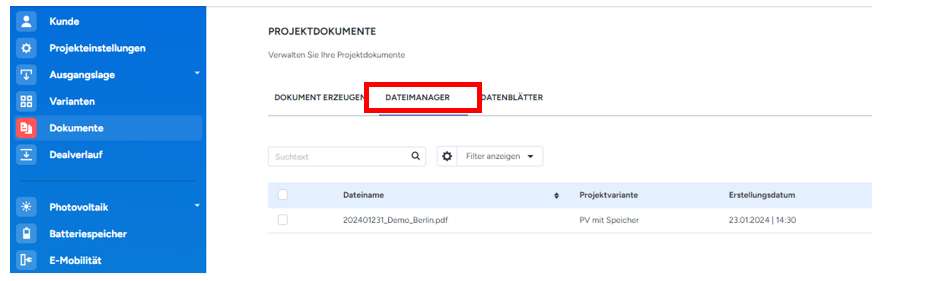Nach dem jeweiligen Generieren befindet sich das Dokument im Dateimanager, wo es heruntergeladen werden kann, um es an Ihren Kunden zu senden.