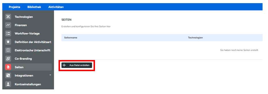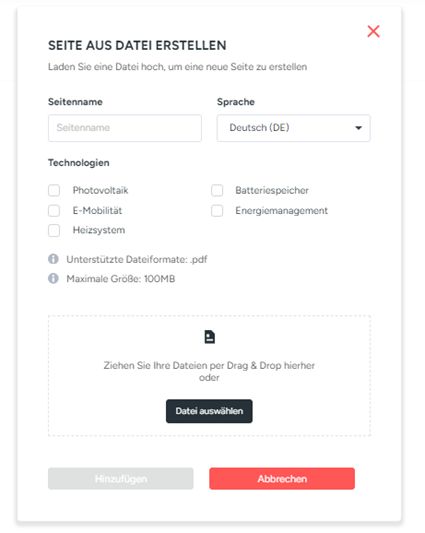 Nach ausfüllen des Seitennamens und auswählen der Technologie und Datei, ändert sich die Farbe des „Hinzufügen-Buttons“ und die Seite kann hinzugefügt werden. Danach kann diese, wie oben beschrieben, im Angebot ausgewählt werden.