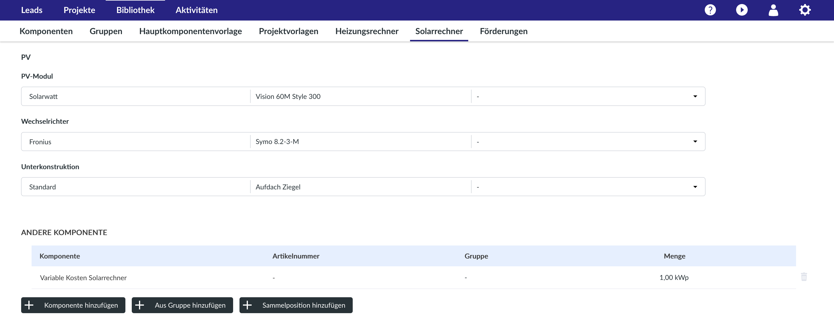 Die hier ausgewählten Komponenten dienen auch als Projektvorlage für neue Projekte, welche im Solarexperten automatisch erstellt werden, wenn ein Endkunde eine neue Anfrage in Ihrem Solarrechner gemacht hat.