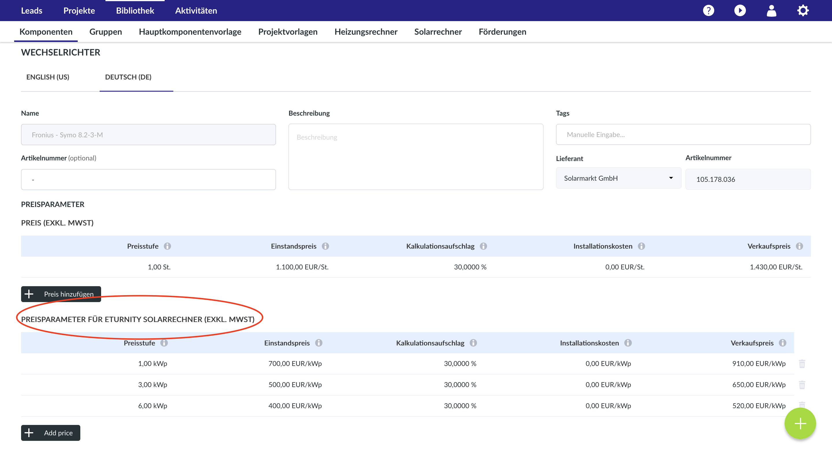 Wenn Sie hier mehrere Komponenten hinterlegen, kann es schwieriger werden die Preise für die verschiedenen Anlagengössen im Solarrecher zu definieren, weil es dann automatisch mehr Faktoren gibt welche diesen beeinflussen.