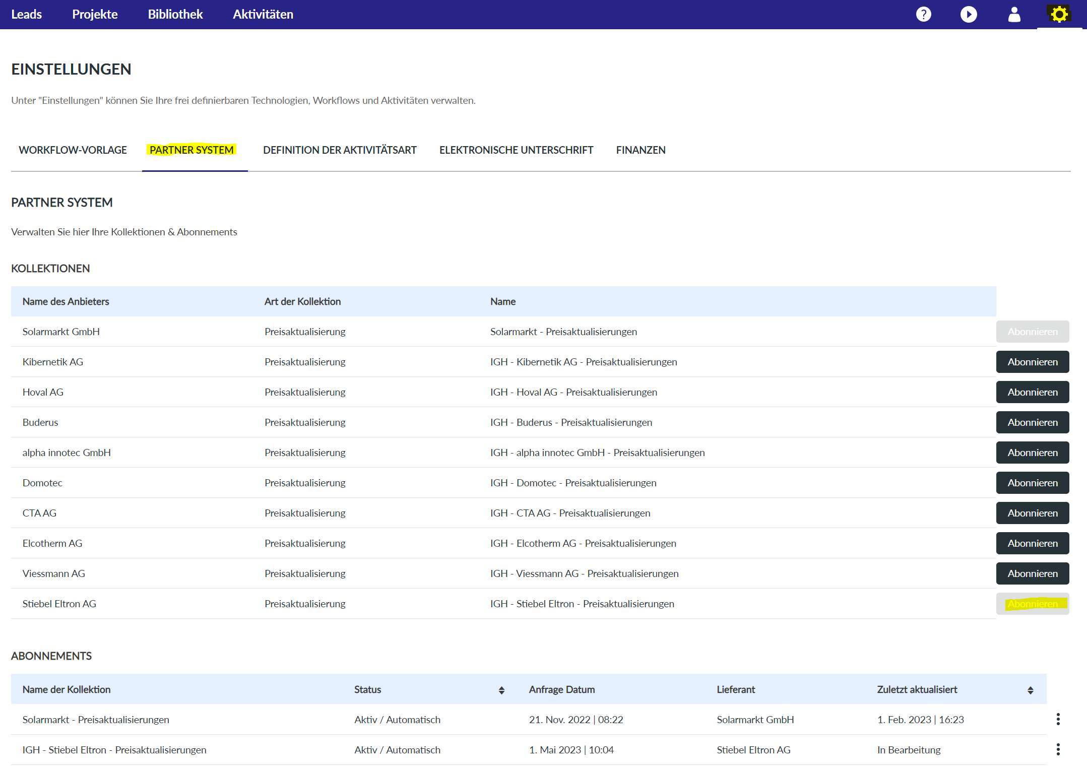 - Aktivieren Sie den Preisabgleich für ausgewählte IGH-Hersteller in Ihren Einstellungen unter "Partner System", indem Sie unter Kollektionen Ihre gewünschten Hersteller Abonnieren.