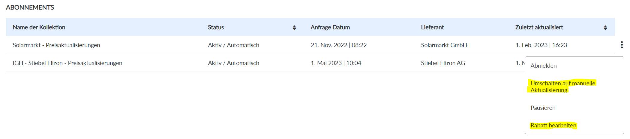 - Sie können Ihre Rabatte pro Kollektion hinterlegen. Diese werden bei den Preisaktualisierungen berücksichtigt. Sie können den Rabatt pro Abonnement über das Kontext-Menu (Klick auf die drei Punkte ganz rechts) definieren.