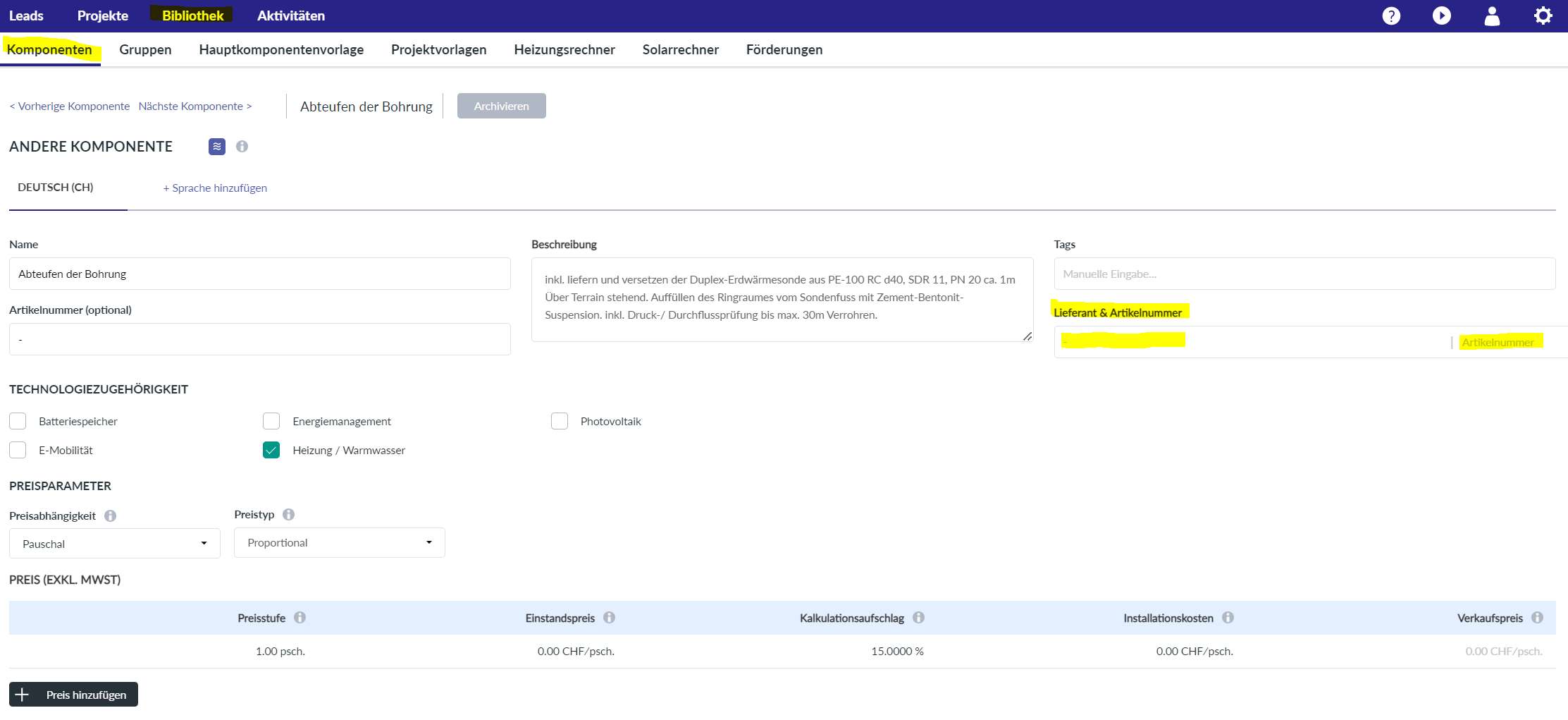 Eturnity sorgt dafür, dass die Hauptkomponenten mit der richtigen Lieferantennummer gepflegt werden. Die Hauptkomponenten müssen lediglich einmal zur eigenen Bibliothek hinzugefügt werden, damit diese dann betreffend dem Preis aktualisiert werden.