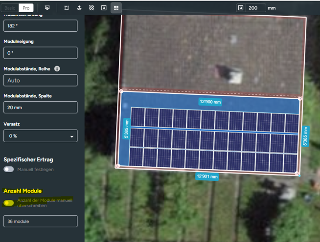 Zeichnen Sie im Pro Mode oder im Basic Mode des Layouting mindestens eine Dachfläche mit mindestens einer Modulfläche.