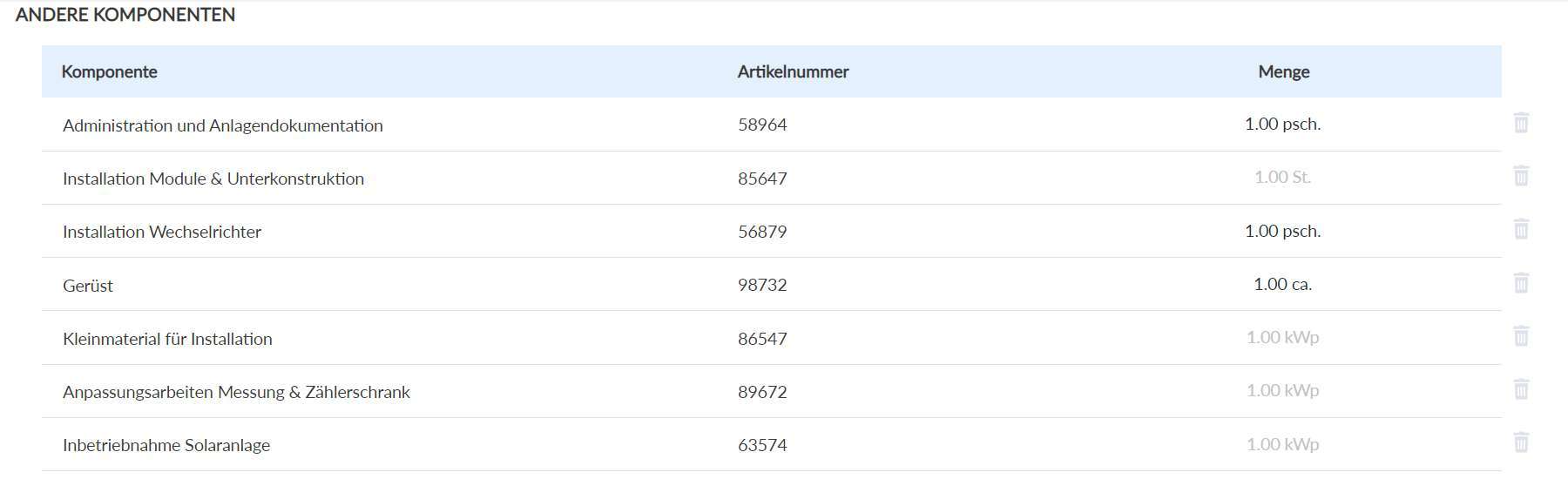 Beispiel einer Gruppe für ein Solarprojekt: Beispielsweise können Sie alle "anderen Komponenten" die Sie für ein Standard-PV-Projekt immer wieder benötigen als Gruppe anlegen.