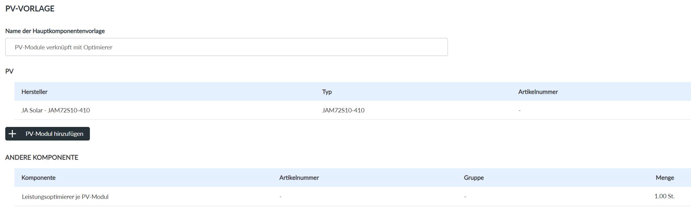 Beispiel einer Hauptkomponentenvorlage für Solarprojekte: Bei der Planung von gewissen PV-Anlagen ist es sinnvoll, PV-Module mit je einem Leistungsoptimierer pro Modul auszustatten. In diesem Zusammenhang bietet sich eine Hauptkomponentenvorlage an. Jedes Mal, wenn das PV-Modul JA Solar - JAM72S10-410 in einem Projekt verwendet wird, kann die Hauptkomponentenvorlage angewendet werden, dann wird die Position des Leistungsoptimierers in der Stückliste ergänzt wird.