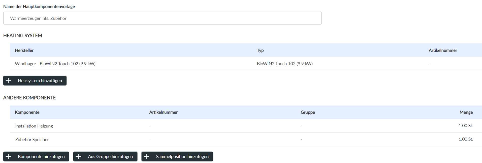 Beispiel einer Hauptkomponentenvorlage für Heizungsprojekte: In diesem Beispiel wurde eine neue Vorlage inkl. Zubehör erstellt. Wenn nun die Windhager - BioWIN2 012 in einem Heizungsprojekt als neuen Wärmeerzeuger ausgewählt und die Hauptkomponentenvorlage angewendet wird, werden beide anderen Komponenten "Installation Heizung" sowie "Zubehör Speicher" automatisch der Stückliste hinzugefügt.