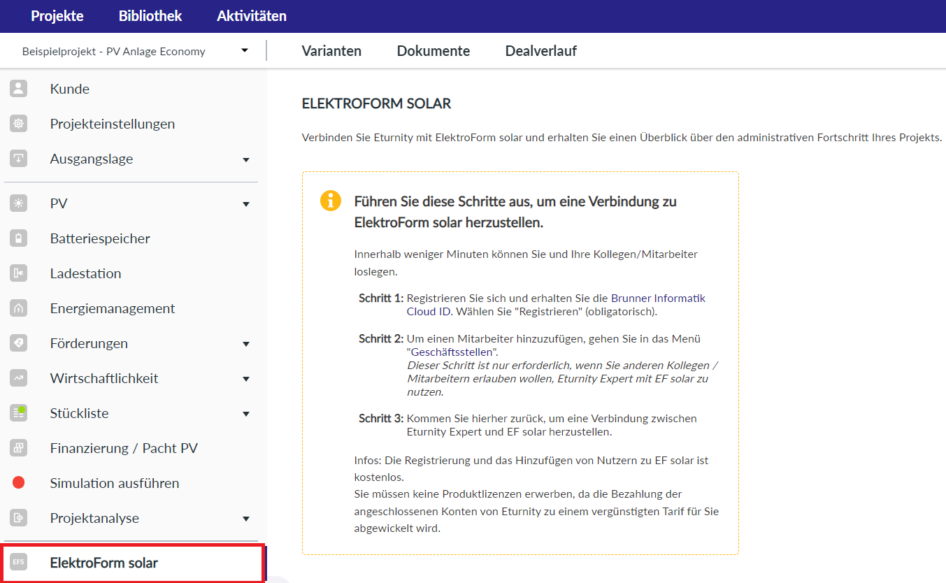 Die Registrierung und das Hinzufügen von Nutzern zu EF solar ist kostenlos. Sie müssen KEINE Produktlizenzen bei Brunner Informatik erwerben, da die Bezahlung der angeschlossenen Konten über Eturnity zu einem vergünstigten Tarif für Sie abgewickelt wird.