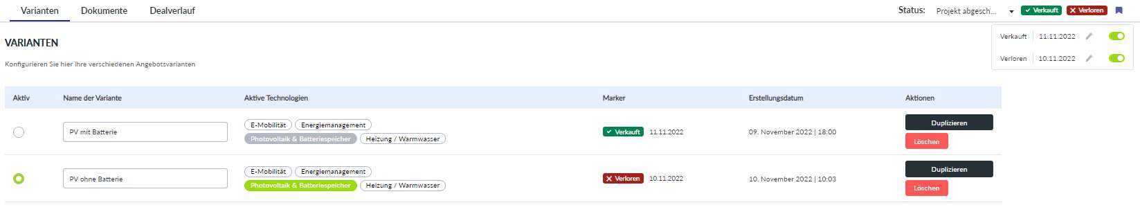Neu werden die Marker pro Projektvariante erfasst und in der Projektvarianten-Übersicht mit Datum dargestellt in Ihrem Eturnity Expert Projekt. Mittels der Statusleiste kann ein Marker aktiviert bzw. deaktiviert, das Datum erfasst sowie einer Projektvariante zugeordnet werden. Standardmässig wird der Marker immer der aktiven Projektvariante zugewiesen.