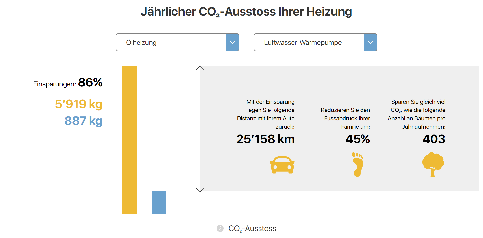 Für jede Ressource können in der Eturnitylösung die CO2-Emissionen pro Ressourceneinheit definiert werden (z.B. 2,650 kgCO2eq/Liter Öl). Der eingegebene oder simulierte Ressourcenverbrauch des bestehenden und neuen Heizsystems wird dann mit den Emissionsfaktoren multipliziert und für die Endkunden kundenfreundlich aufbereitet: