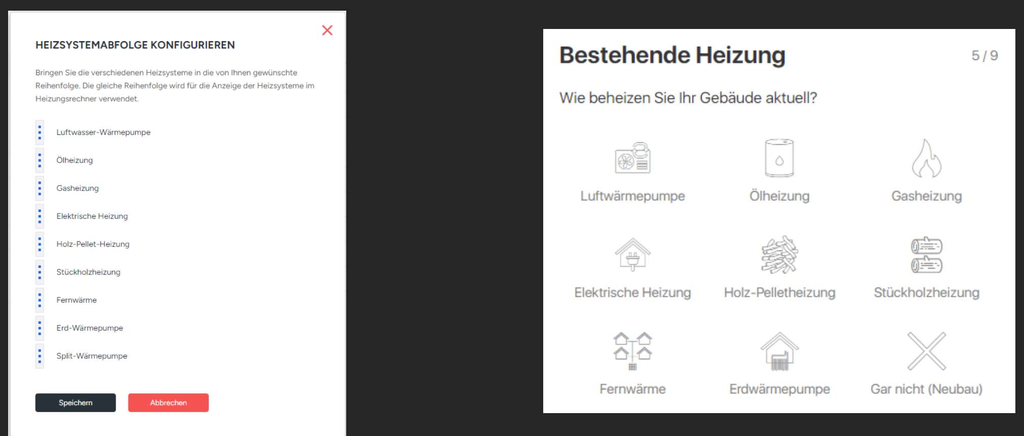 Hier können Sie die Reihenfolgen anpassen, in der die Technologien für die bestehende Heizung in Ihrem Heizungsrechner aufgelistet werden.