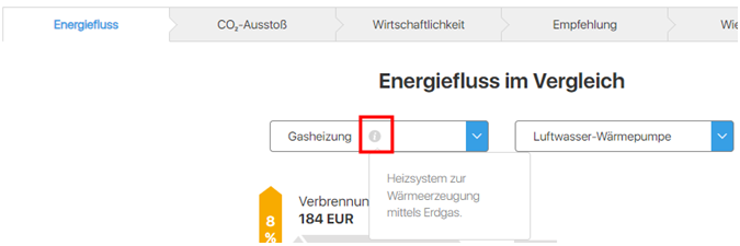 Bei Beschreibung können Sie eine Beschreibung des Heizsystems hinterlegen. Daraufhin erscheint ein Info-Symbol im Heizungsrechner, unter dem dann Ihr Kunde den hinterlegten Text sehen kann. Ist keine Beschreibung hinterlegt, erscheint auch kein Info-Symbol.