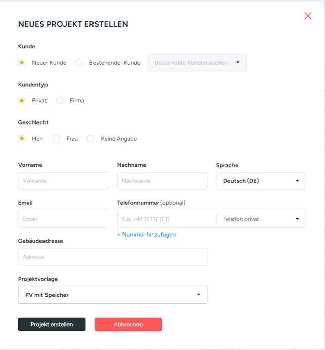 und die Objektadresse ein und wählen Sie die gewünschte Projektvorlage. Diese
