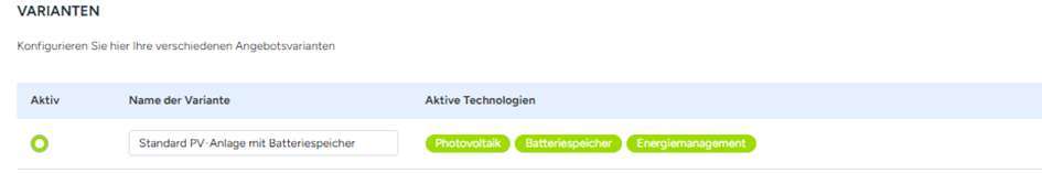 Beim nächsten Menüpunkt Batteriespeicher kann ein entsprechender Akku aus Ihrer Bibliothek für die PV-Anlage gewählt werden. Sollte hier nicht die gewünschte Komponente auswählbar sein, muss diese zuerst über die Bibliothek hinzugefügt werden. Falls der Punkt Batteriespeicher gar nicht erst angezeigt wird, aktivieren Sie zuerst die Technologie für dieses Projekt unter Varianten. Die jeweilige Technologie ist aktiviert, wenn diese, wie im Bild unten, grün hinterlegt ist. Mehr Informationen zu Varianten finden Sie unten in diesem Artikel.