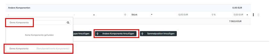 Es ist ebenso möglich, ohne vorheriges erfassen in der Bibliothek, weitere Einträge direkt in die Stückliste mit aufzunehmen. Hierzu wird nach einem Klick auf „Andere Komponente hinzufügen“ im Suchfeld des Dropdownmenüs eine entsprechende Bezeichnung eingegeben und „Benutzerdefinierte Komponente“ ausgewählt. Anschließend kann ein entsprechender Preis eingegeben werden.