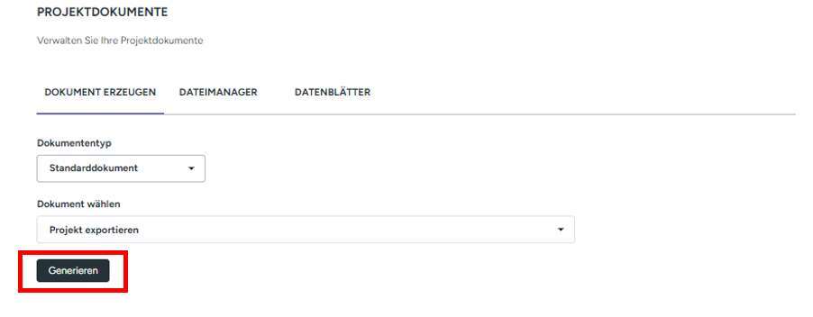 - Erstellen und Exportieren einer .csv Datei, welche wiederum in einer weiterführenden Software, beispielsweise einem ERP-Programm, importiert werden kann.Hierzu wählen Sie unter Dokumententyp „Standarddokument“ und Projekt exportieren aus. Mit einem Klick auf „Generieren“ wird das Dokument erzeugt.