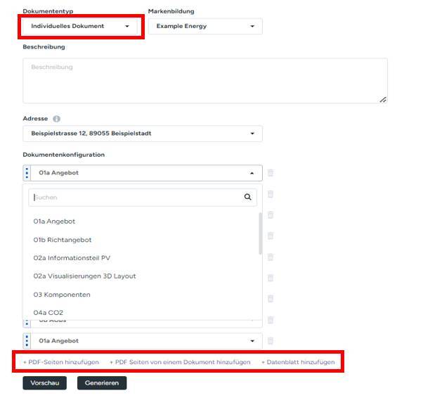 Dazu wählen Sie als Dokumententyp „Individuelles Dokument“. Nach Auswahl der richtigen Marke und der Adresse kann unter „Dokumentenkonfiguration“ das Layout angepasst werden. Mit „PDF-Seiten hinzufügen“ wird zuerst die grobe Seitenanzahl des Angebotes festgelegt. Anschließend kann mit Hilfe des Dropdownmenüs die entsprechende Seite ausgewählt werden. Sollte die gewünschte Seite nicht zur Auswahl stehen, ist es ebenfalls möglich diese hinzuzufügen. Weitere Infos finden Sie in diesem Artikel weiter unten.