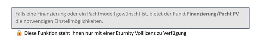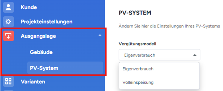 Unter Ausgangslage PV System kann abschließend das Vergütungsmodell der Anlage (Eigenverbrauch mit Teileinspeisung oder Volleinspeisung) gewählt werden.
