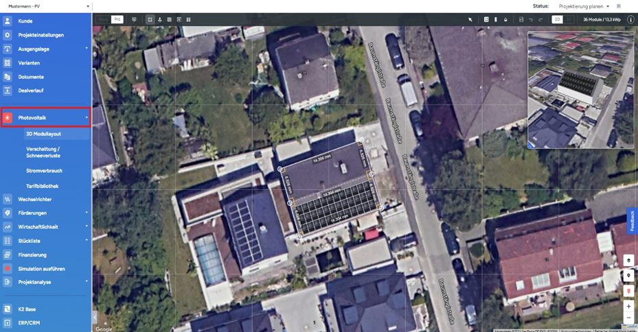 Um ein Solarprojekt schnell und effektiv zu planen, gehen Sie in der linken Liste die Punkte von „Photovoltaik“ bis zu „Simulation aktualisieren“ Schritt für Schritt durch.