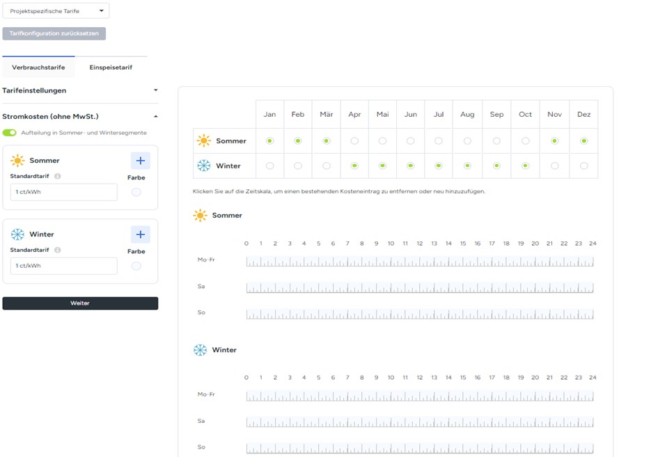 Diese müssen zuvor in den Einstellungen unter „Stromtarife“ hinterlegt werden. Es kann ein individueller Einspeise- sowie Verbrauchstarif eingestellt werden. Anschließend können diese in einem jeweiligen Projekt ausgewählt werden. Sehen Sie hierzu unseren gesonderten Artikel.