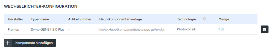 Bei der „Wechselrichter-Konfiguration“ können Sie die gewünschte Komponente mit Hilfe des Dropdownmenüs auswählen. Mit dem Button „Komponente hinzufügen“ können weitere Wechselrichter ausgewählt werden. Abschließend muss jedem Wechselrichter eine Technologie zugeteilt werden. Einmal für die PV-Anlage und, falls zutreffend, einmal für den Batteriespeicher. Dies dient dazu die Kosten für die Wechselrichter in der Stückliste den jeweiligen Obergruppen (PV-Anlage bzw. Batteriespeicher) zuzuordnen. Sollten Sie einen Hybridwechselrichter gewählt haben der sowohl für die PV-Anlage als auch den Batteriespeicher verwendet wird, dann können Sie wählen, welchem Teil des Systems die Wechselrichterkosten zugewiesen werden sollen.