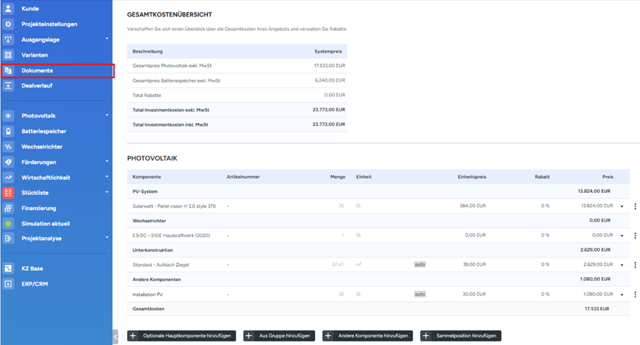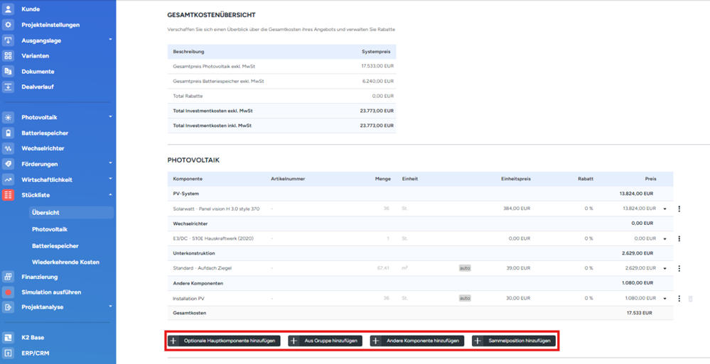 Weiter unten folgen die detaillierten Kosten, gegliedert in die jeweiligen Gruppen des PV-Systems. Über die schwarzen Buttons unterhalb kann jeweils die Stückliste mit weiteren Komponenten, welche vorher in der Bibliothek angelegt wurden, ergänzt werden. Bitte beachten Sie, dass bei einer Partnerlizenz das Hinzufügen von Gruppen und Sammelpositionen zwar möglich ist, diese aber nicht selbständig erstellt werden können. Hierfür kontaktieren Sie bitte ihre zuständigen Owner.