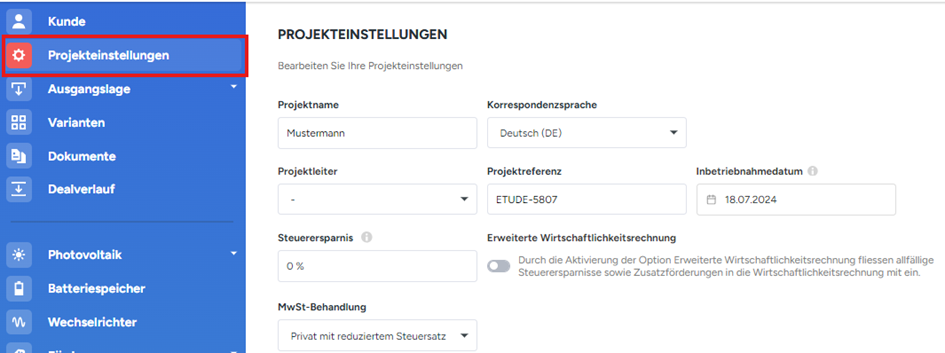 Unter Projekteinstellungen kann beispielsweise der Projektname, Projektleiter und die Mehrwertsteuerbehandlung angepasst werden.
