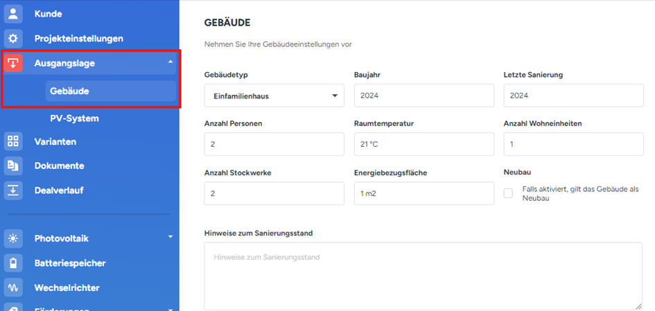 Unter dem Punkt Ausgangslage Gebäude können weitere Informationen wie beispielsweise das Baujahr, der Gebäudetyp oder die Anzahl der Stockwerke eingetragen werden.
