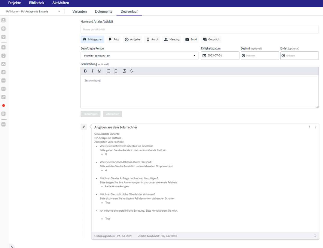 Unter Dealverlauf > Notizen wird beim entsprechenden Projekt eine Notiz mit den Antworten erstellt.