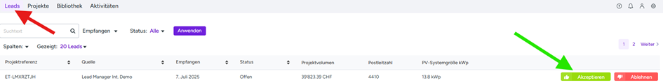 • den Lead akzeptieren (grüner Pfeil), um alle Kundendaten einzusehen, oder