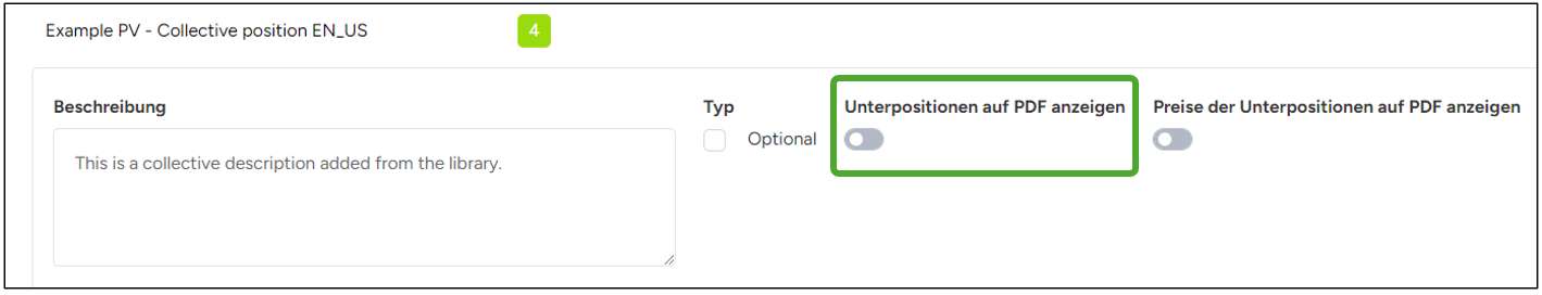 - Aktivieren Sie den Schalter Unterpositionen auf PDF anzeigen, um die Unterpositionen in die Übertragung an Bexio mit einzubeziehen.