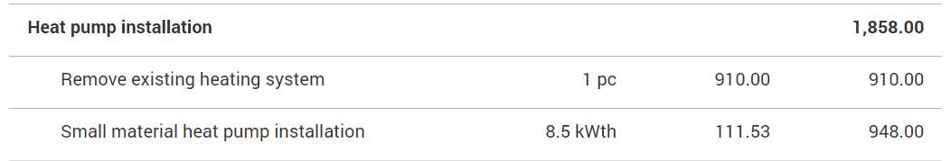 In the generated PDF, a collective position stands out from the representation of a group with other components because the top-level position is bolded, and the sub positions are indented and presented as belonging to the top-level position, either with or without prices.