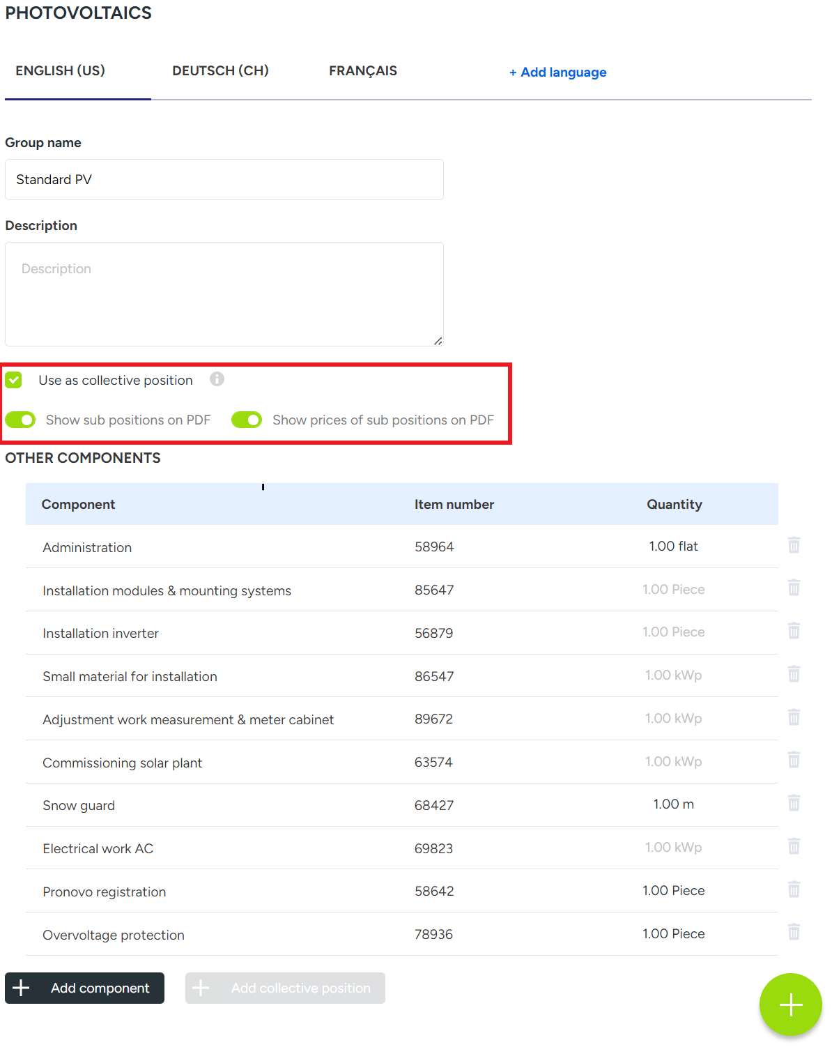 For each collective position, you can define whether the sub positions should be displayed on the PDF and whether the prices of the sub positions should also be displayed. You can control this by enabling the "Show sub positions on PDF" and "Show prices of sub positions on PDF" sliders, either directly in the library or in the bill of materials for the respective collective position in the project.