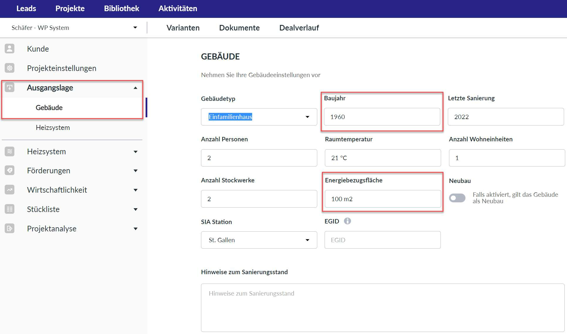 3. The year of construction and the energy reference area must be entered under the initial situation of the building.