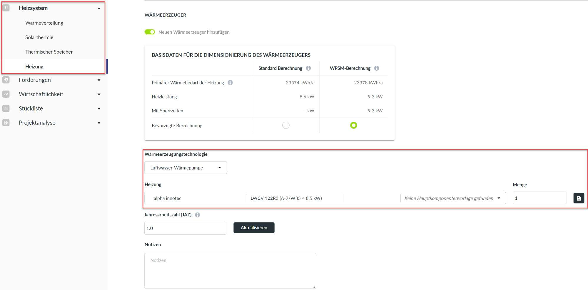 5. Under Heating system heating, the technology as well as the heat generator manufacturer and type are defined via dropdown.