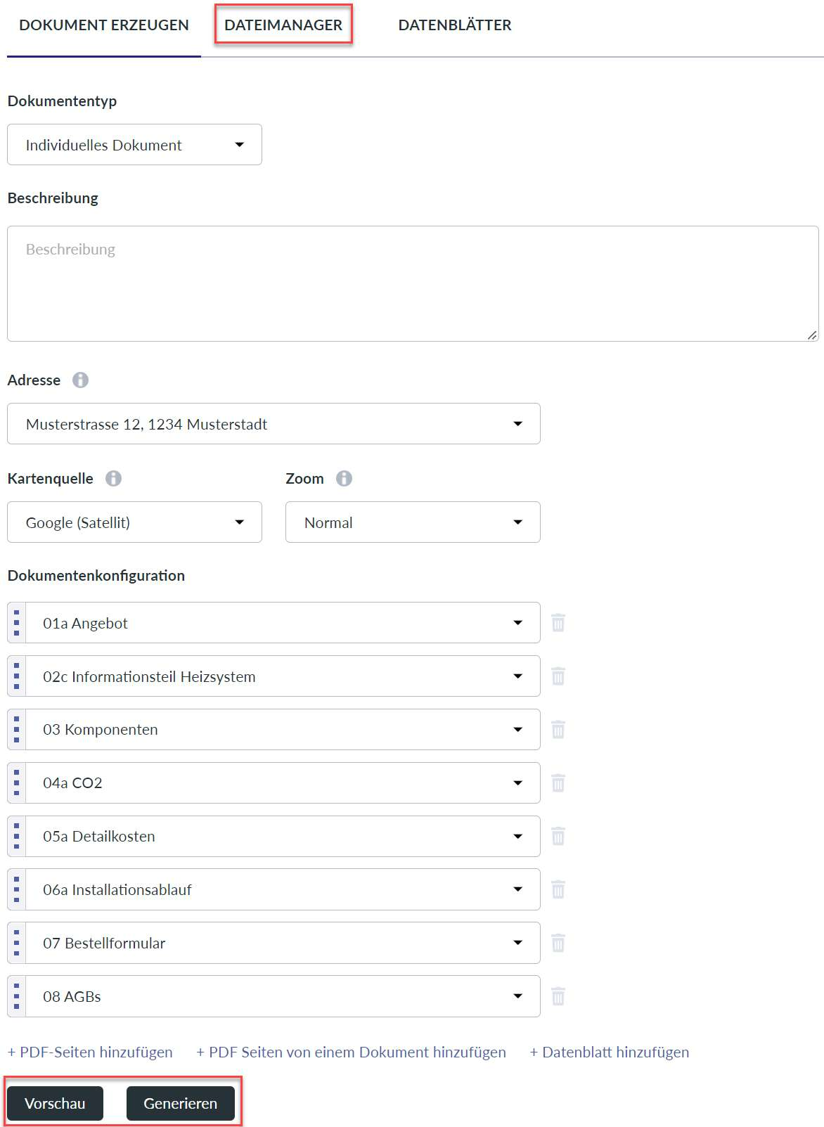 9. Save again and then the document can be previewed or generated and downloaded in the file manager.