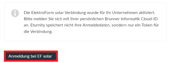 After logging in to Brunner Informatik, you return automatically to the Eturnity Expert and can start transferring projects by clicking on the Projektdaten an EF solar übertragen button.
