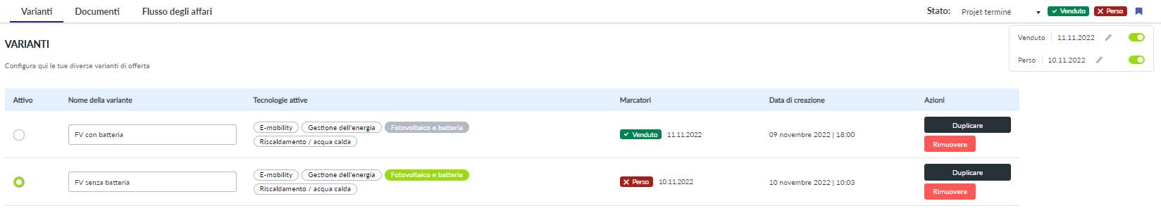 I marcatori sono ora elencati per ogni variante di progetto e visualizzati con la data nella panoramica delle varianti di progetto nel vostro progetto Eturnity Expert. Tramite la barra di stato, è possibile attivare o disattivare un marcatore, registrare la data e assegnarlo a una variante di progetto. Per impostazione predefinita, l'indicatore è sempre assegnato alla variante di progetto attiva.