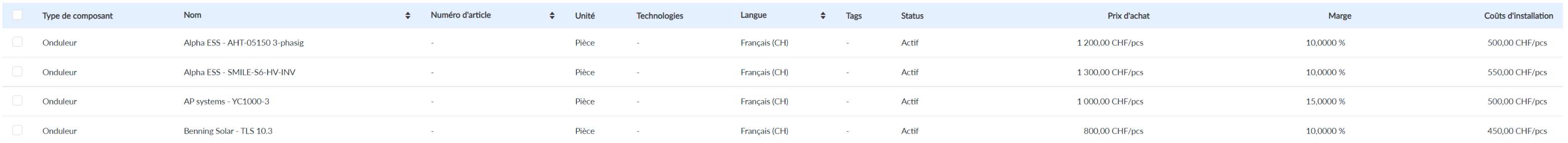 Les colonnes récemment introduites Prix d'achat, Marge et Coûts d'installation sont maintenant affichées par défaut dans la vue d'ensemble des composants, de sorte que les prix peuvent être modifiés facilement à partir de la vue d'ensemble.