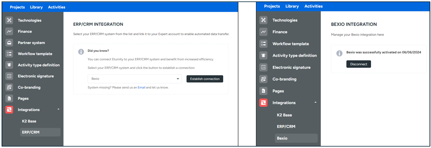 In Eturnity Expert, you have the option to connect it with the ERP/CRM system, Bexio using your personal account, to enable automated data transfer.