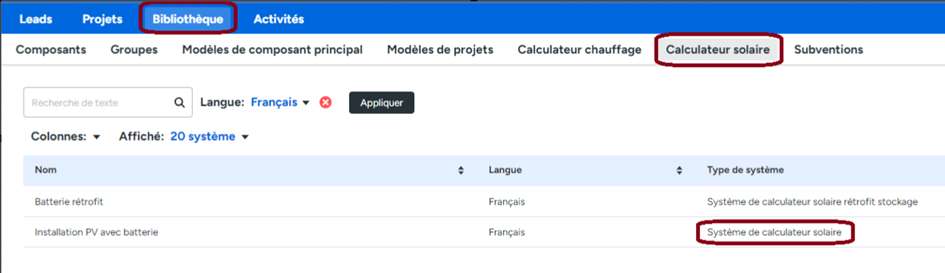 sous-menu Calculateur solaire. Dans la liste affichée, sélectionnez un système