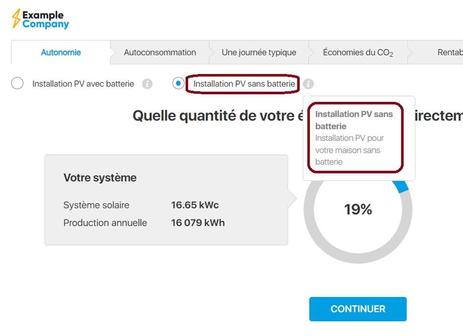 Comme il y a des clients qui veulent devenir aussi indépendants que possible avec un système de stockage par batterie, ainsi que des clients qui veulent un système de stockage par batterie aussi économique que possible, il est recommandé d'entrer un système de stockage par batterie avec une capacité moyenne et un bon rapport qualité-prix, afin que le résultat concernant l'indépendance et l'économie dans le calculateur solaire soit attrayant pour les deux groupes de clients.