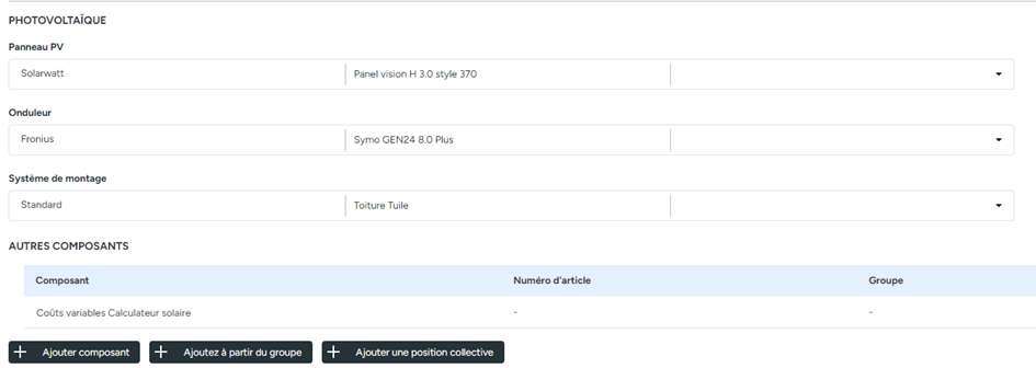 Sous "Autres composants", nous recommandons de ne stocker qu'une position auxiliaire telle que "Coûts variables calculateur solaire". Vous pouvez alors facilement utiliser cette position comme vis de réglage pour définir votre structure de prix individuelle dans le calculateur solaire.