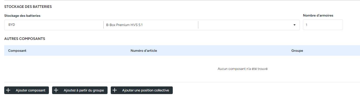 Si vous descendez encore plus bas, vous arriverez à la sélection des composants standard pour le système de stockage de la batterie à utiliser dans le calculateur solaire.