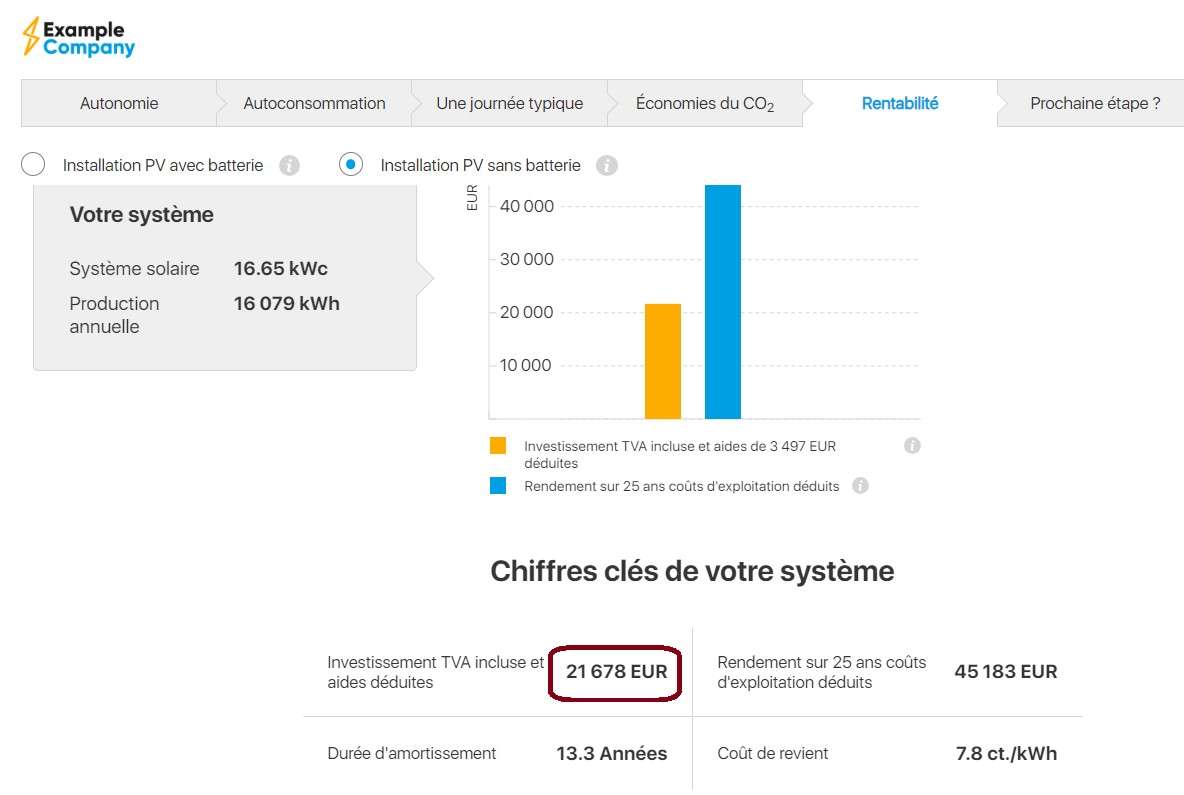 Cette indication de prix est basée d'une part sur la taille de l'installation photovoltaïque estimée par le calculateur solaire et d'autre part sur les prix des composants standard stockés dans la bibliothèque du système de calcul solaire.