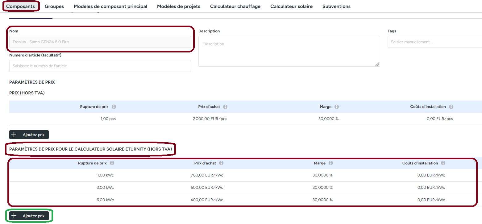 En particulier pour l'onduleur stocké dans la calculatrice solaire, vous pouvez stocker un prix par kWp avec plusieurs niveaux de prix dans la bibliothèque au lieu d'un prix par unité, de sorte que le même prix unitaire n'est pas toujours utilisé pour l'onduleur, même si la taille de l'installation diffère considérablement de la puissance de l'onduleur stocké.