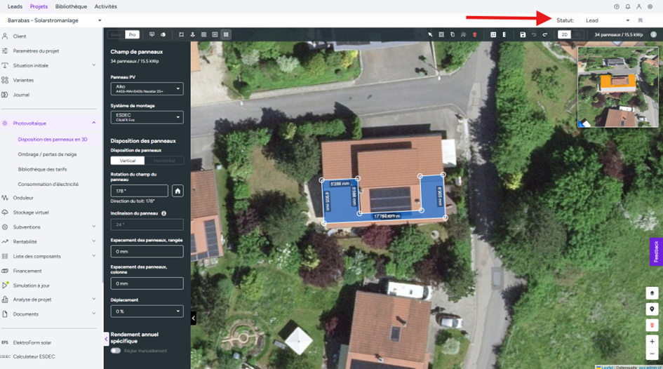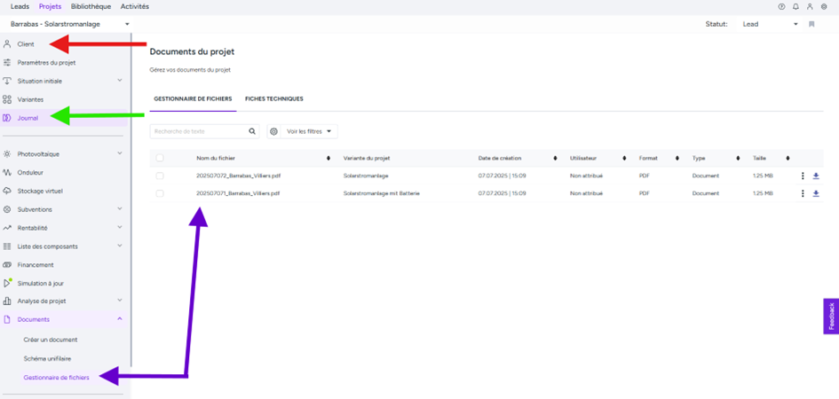 - Gestionnaire de fichiers (flèches violettes) : le document PDF contenant la simulation d’installation que le client a reçu
